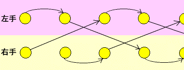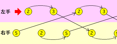 それぞれ矢印の先までの「投げ」の数が変わるのでサイトスワップが変わります。「5・2・2・3」というパターンが現れました。逆に言えば、「5・2・2・3」の左手の動きを半テンポ前に動かすと(1サイクル,2サイクルx)(2サイクルx,1サイクル)というパターンになるということです。